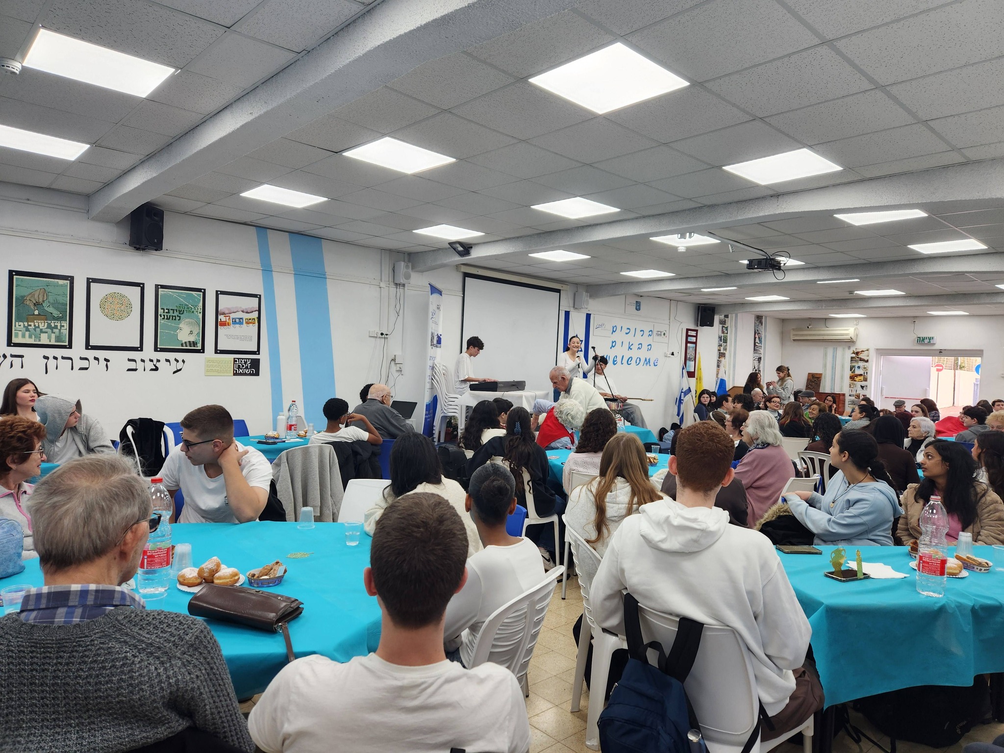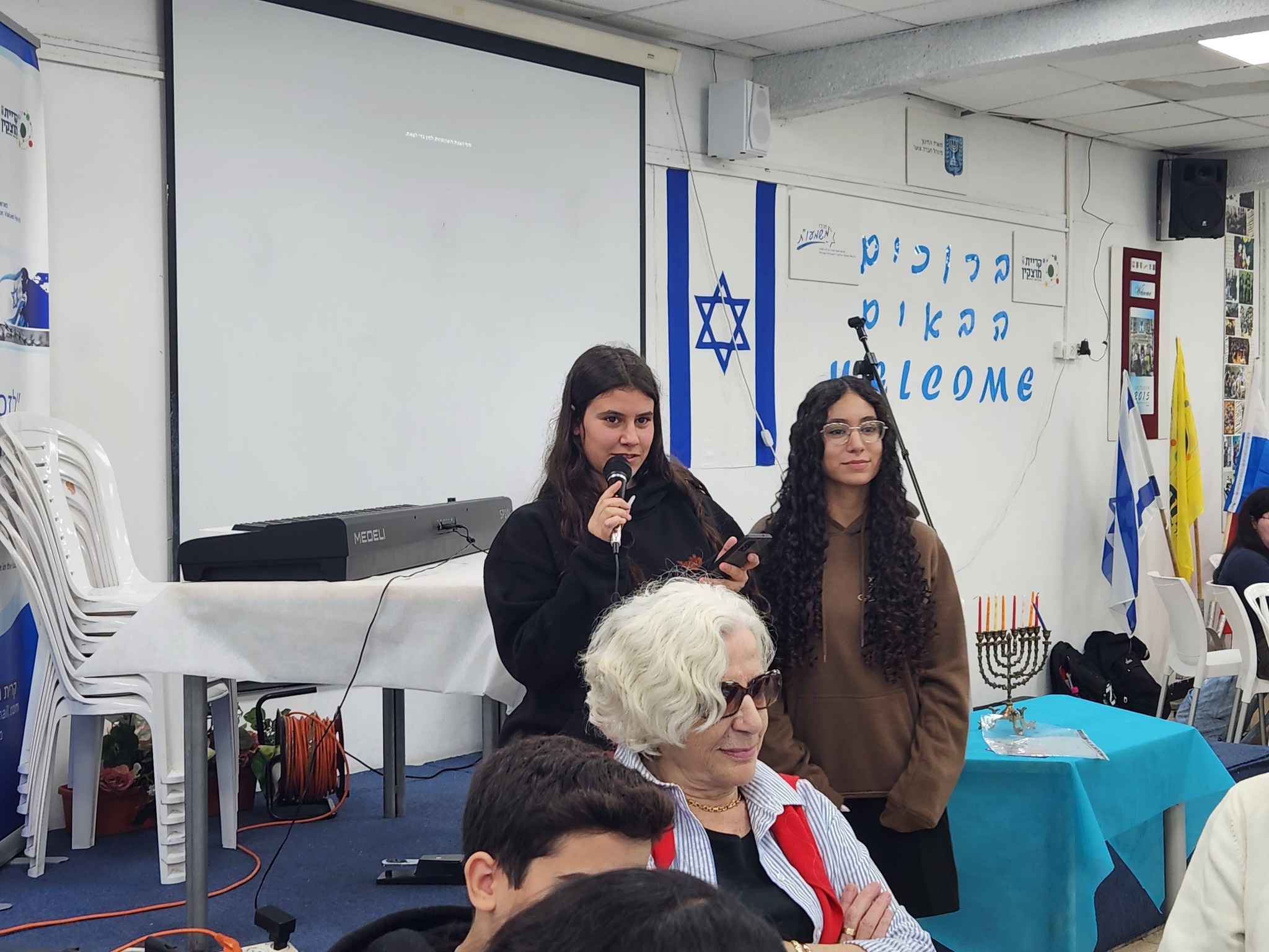 The Afek Hatav students' band, directed by Galit Oren, and representatives from Ulpanat Segula, who were invited to the event, greeted the Holocaust survivors and held a short performance. Not a single eye was left dry when Holocaust survivor Avraham Lerner greeted us with his traditional blessing, "That we have lived and sustained and reached this time."